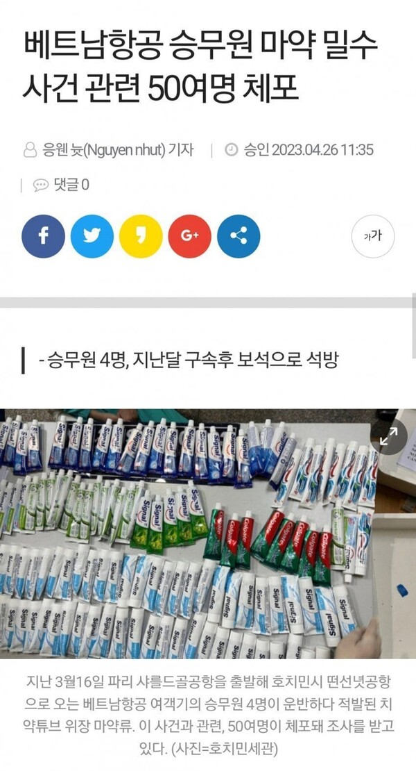 베트남 국영 항공사의 승무원들이 치약튜브로 마약을 밀반입하다 적발된 사례가 있다. 베트남 현지 매체인 VN 익스프레스는 호치민 공안이 오전 떤선녓 국제공항에서 파리발 베트남항공 VN10편에 탑승한 여성 승무원 4명을 검거한 바 있다. 바로 저 사진에 보인것은 치약이 아니라 마약이었던 것이다.